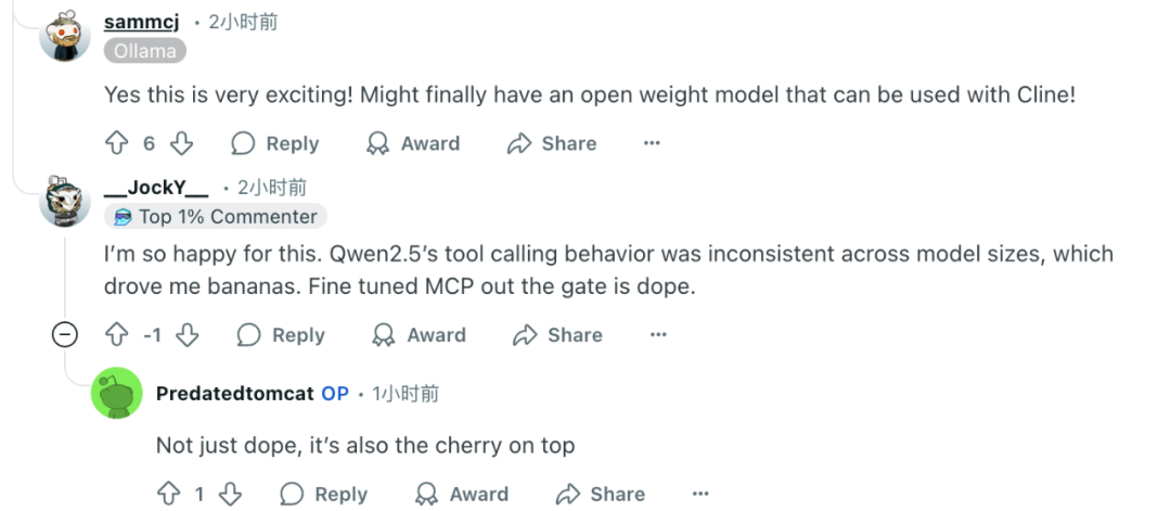 支持 MCP 的功能确实让社区开发者们感到兴奋。“Qwen2.5 的工具调用行为在不同型号之间不一致,这让我抓狂。微调后的 MCP 真是太棒了。”有开发者说道。