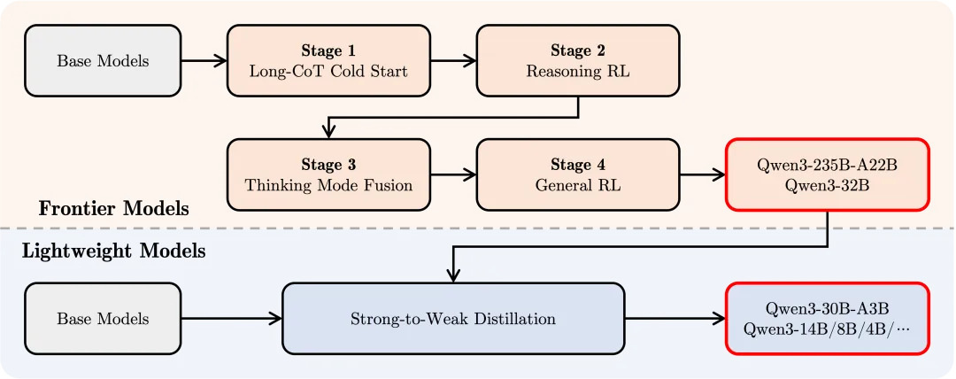 为了开发能够同时具备思考推理和快速响应能力的混合模型,我们实施了一个四阶段的训练流程。该流程包括:(1)长思维链冷启动,(2)长思维链强化学习,(3)思维模式融合,以及(4)通用强化学习。