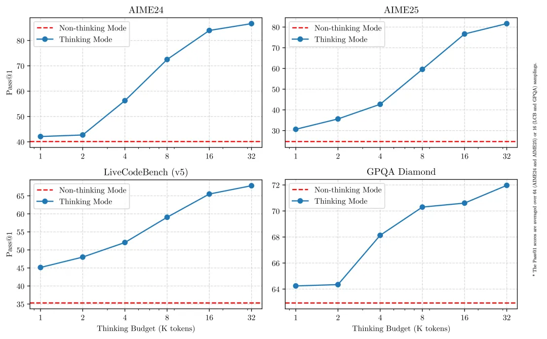 在第三阶段,我们在一份包括长思维链数据和常用的指令微调数据的组合数据上对模型进行微调,将非思考模式整合到思考模型中。确保了推理和快速响应能力的无缝结合。最后,在第四阶段,我们在包括指令遵循、格式遵循和 Agent 能力等在内的 20 多个通用领域的任务上应用了强化学习,以进一步增强模型的通用能力并纠正不良行为。