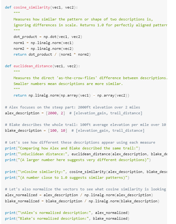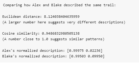 完全与现实相符:亚历克斯和布莱克徒步了同一条路线,但在写评论时关注了不同的部分。亚历克斯关注了较陡的部分,描述了100英尺的爬升,而布莱克描述了整个路线的轮廓,平均每英里上升200英尺,总共10英里。余弦相似度将这些描述识别为相同路线模式的变体,而欧几里得距离则将它们视为完全不同的路线。