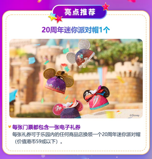 7月26日之前购买“1日门票送20周年迷你派对帽”,就能获得20周年迷你派对帽作为免费礼物,而且帽子造型还有一系列丰富的迪士尼朋友可选噢!