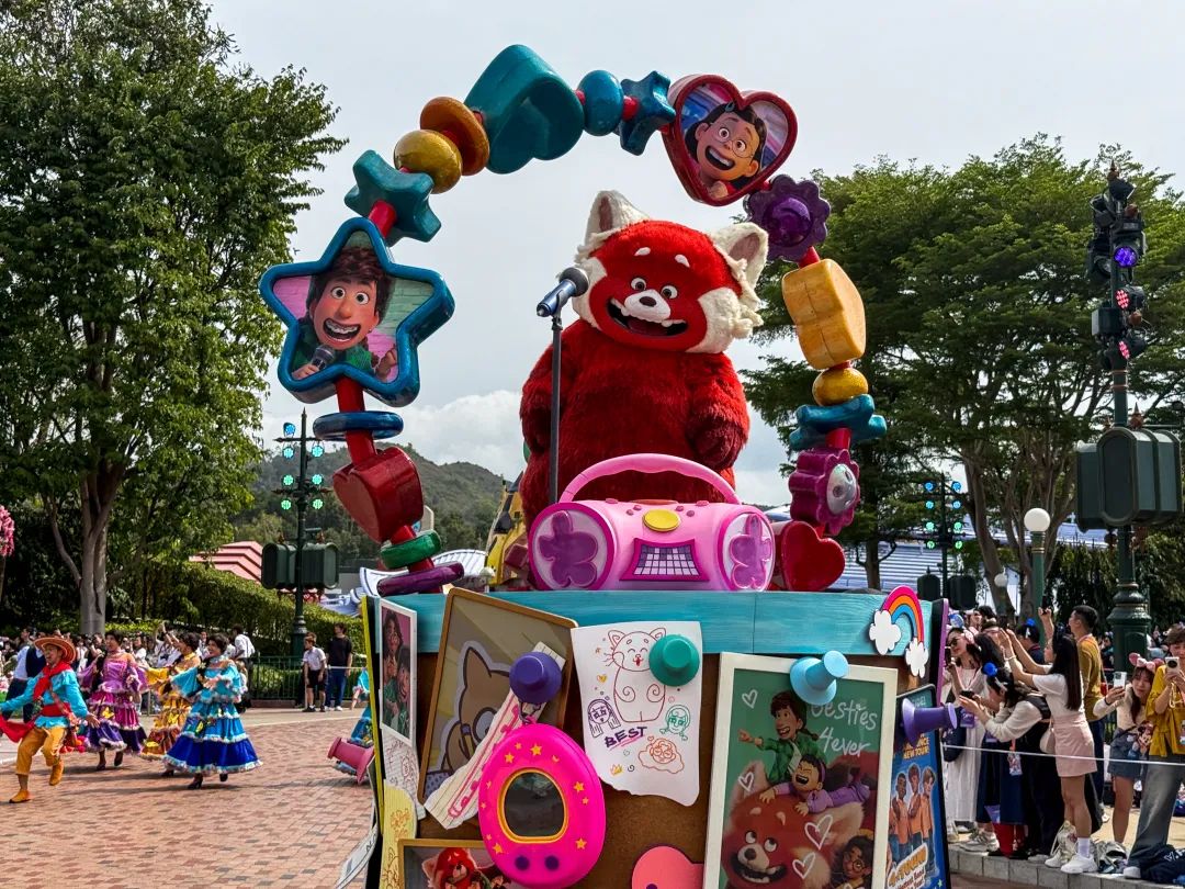 “青春变形记”主题花车随后跟上,红熊猫毛茸茸的橘红色身躯、湿漉漉的大眼睛、鼻尖还沾着粉色绒毛。