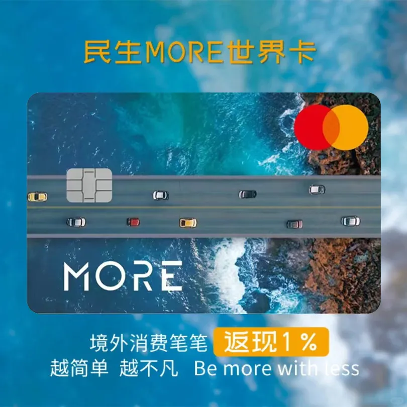 民生More卡重磅回归!有效期内免年费,高颜值万事达世界卡,境内外通用,境外消费1%返现,更有机会匹配携程钻石会籍!