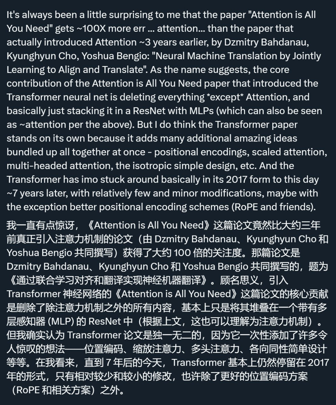 在去年的一个帖子中,,Bahdanau 等人在单层上引入软注意力的那项工作——「Neural Machine Translation by Jointly Learning to Align and Translate」才是真正引入注意力机制的论文(最近拿到了 的亚军),但「Attention is all you need」所受到的关注却是它的 100 多倍。不过,他也承认,「Attention is all you need」这篇论文有其独特性。