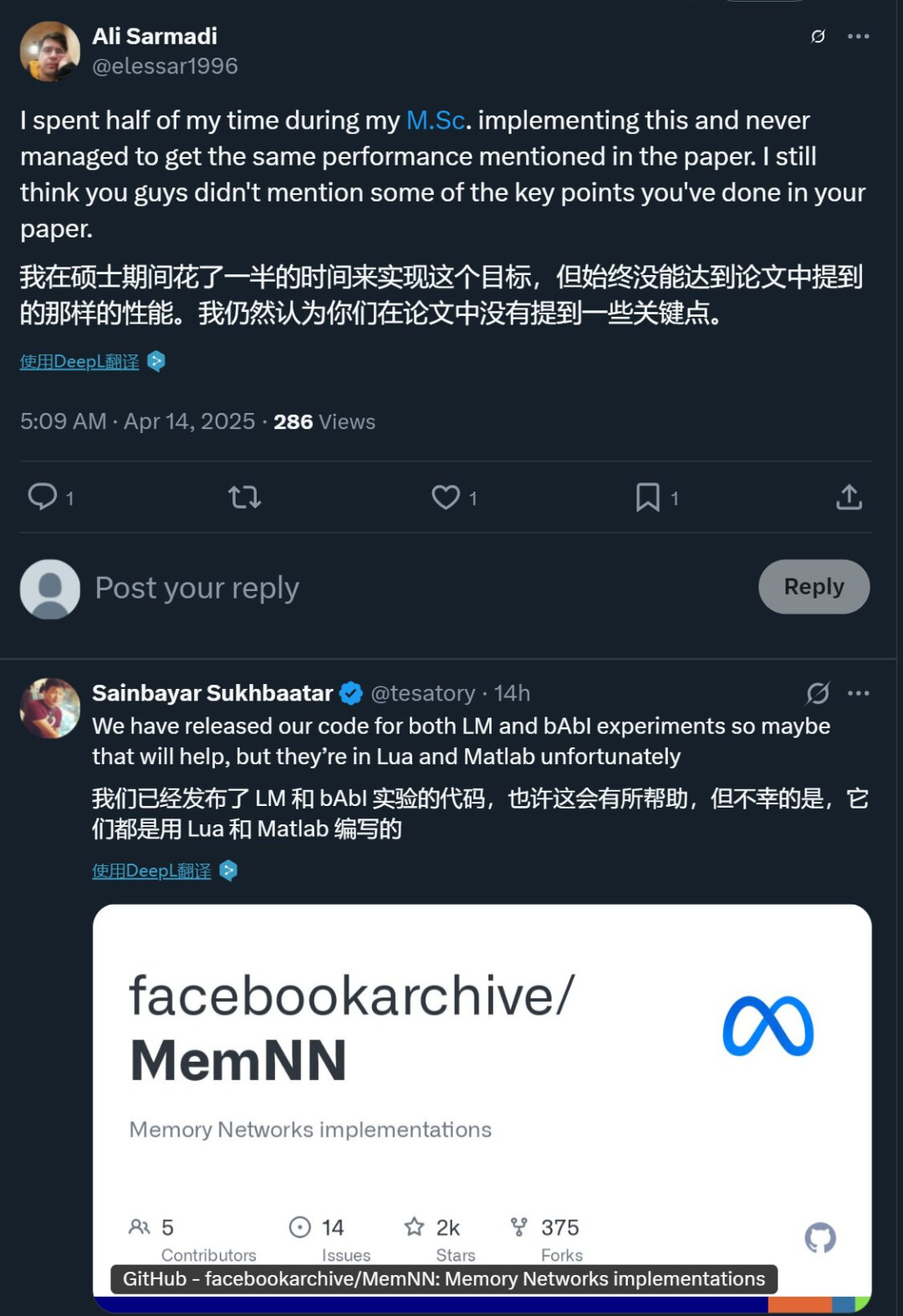 论文一作、Meta 研究科学家 Sainbayar Sukhbaatar 在最近的一则推文中说道「回顾过去,这篇论文包含了当前大型语言模型的许多要素。我们的模型是首个完全用注意力机制替代 RNN 的语言模型;它引入了带键值投影的点积软注意力机制,堆叠了多层注意力,使模型能关注输入的不同部分;它还引入位置嵌入来解决注意力机制中的顺序不变性问题……」