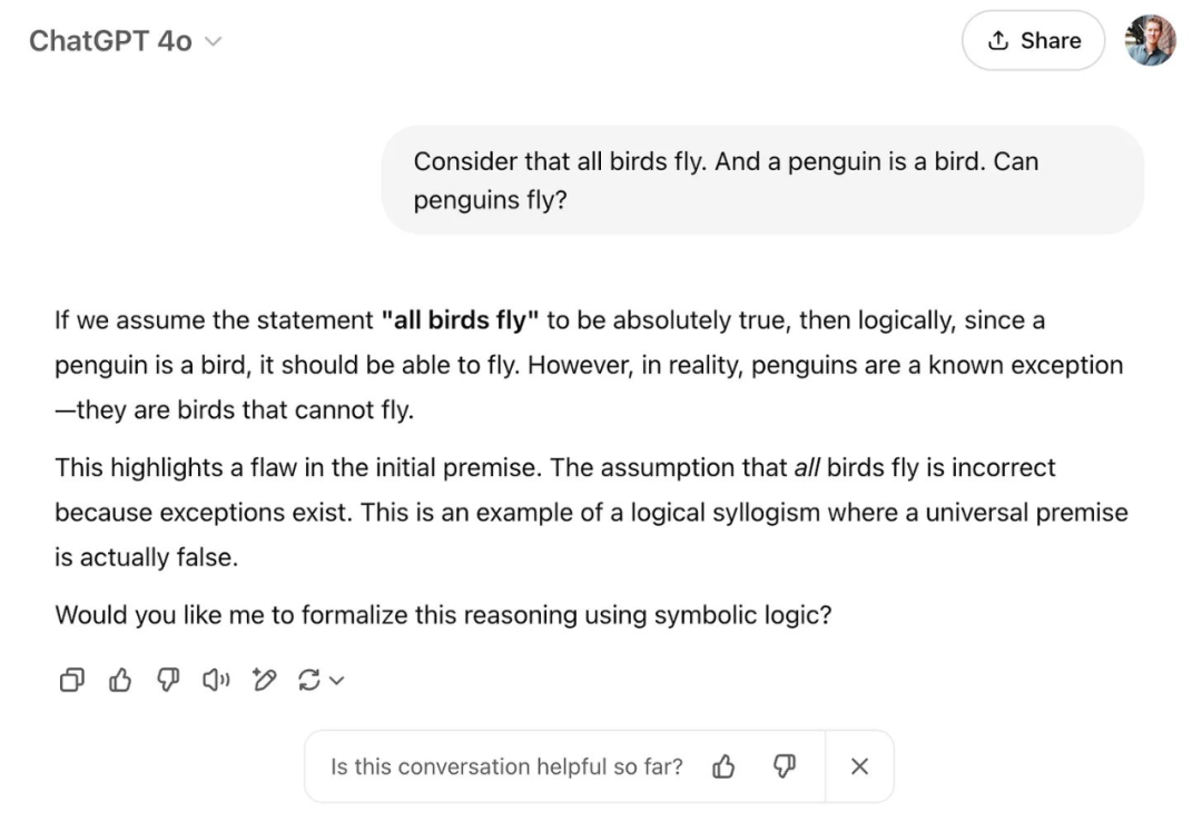 现在让我们看个具体例子(见图 5):像 GPT-4o 这样没有专门加强推理能力的模型,遇到这个「所有鸟都会飞...」的问题时,会怎么回答呢?