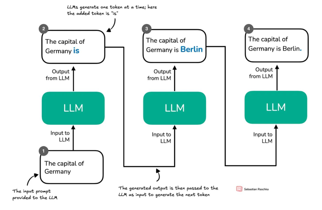 图 7:LLM 中的逐个 token 生成。在每一步,LLM 都会获取迄今为止生成的完整序列并预测下一个 token—— 可能代表词、子词或标点符号,具体取决于 token 化器。新生成的 token 会被附加到序列中,并用作下一步的输入。这种迭代解码过程既用于标准语言模型,也用于以推理为中心的模型。