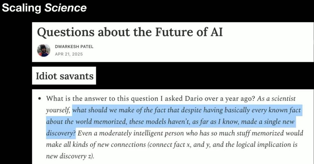 这张图来自播客主理人 Dwarkesh。他问,既然现在 LLM 已经记住了如此多的知识,为什么还没有做出什么科学发现呢?