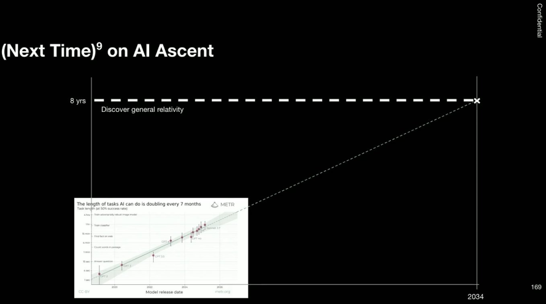 不过,预测 AI 的发展并不容易,大家总是错的。但假如这张图的预测是对的,沿着其趋势,到 2034 年 AI Ascent 时,AI 将有能力进行长达 8 年的计算和思考 —— 而 8 年正是爱因斯坦发现广义相对论所用的时间。