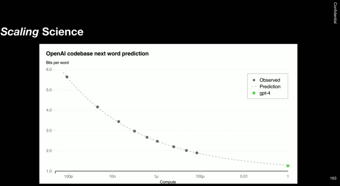 这张图来自介绍 GPT-4 的博客文章,那时候我还没有加入 OpenAI,但这张图确实振奋人心。下面的绿点是 GPT-4 的最终损失性能,前面的灰点是训练过程中记录的性能。而这张图采用了对数尺度。