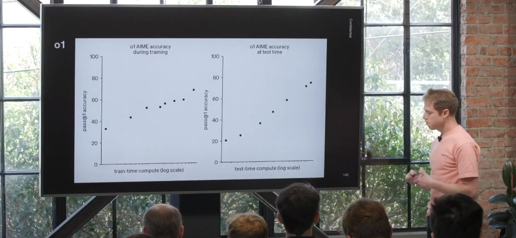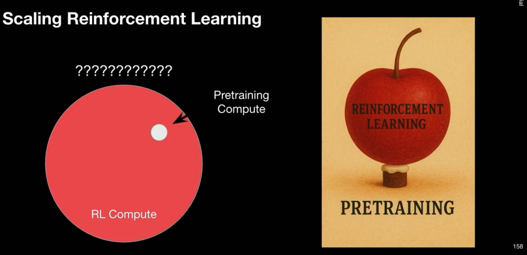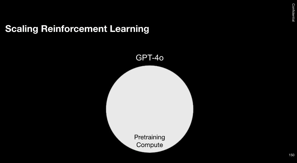 这次演讲我最想传达的核心信息是:我们需要持续扩大强化学习的规模。一年前,我们发布了 GPT-4o,当时所有的计算资源都投入在预训练(pre-training)上。