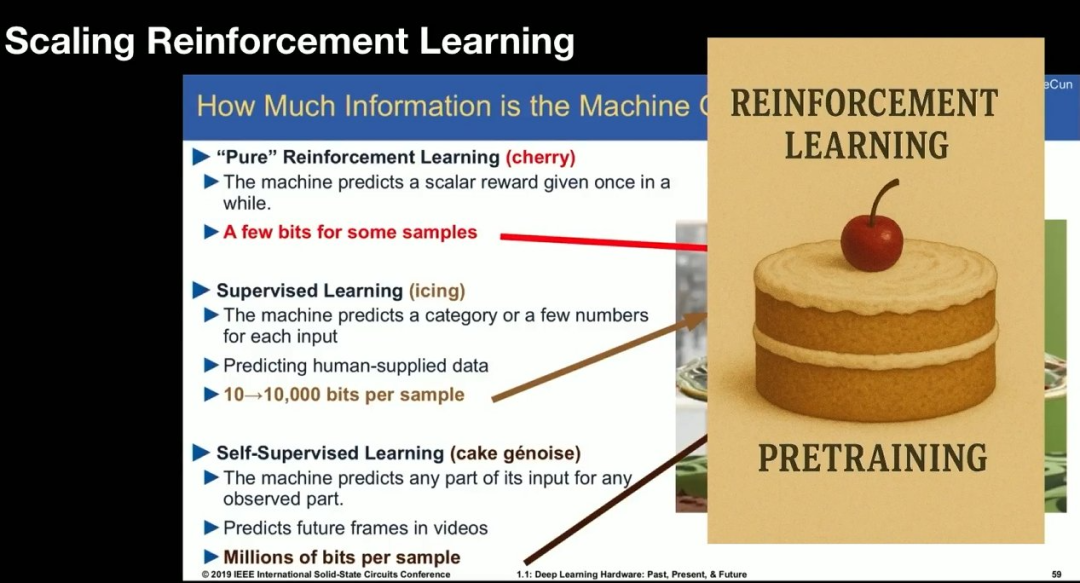 这是我从 Yann LeCun 的幻灯片借的一张图,大概是他 2019 年的一场演讲。这张幻灯片有点复杂,难以理解。其中关键在于:预训练就像这个大蛋糕,强化学习应该像上面的小樱桃。我们实际上要做的是颠覆这个迷因。我们的蛋糕大小可能不会变化,但我们可能会有一颗超大的强化学习樱桃。