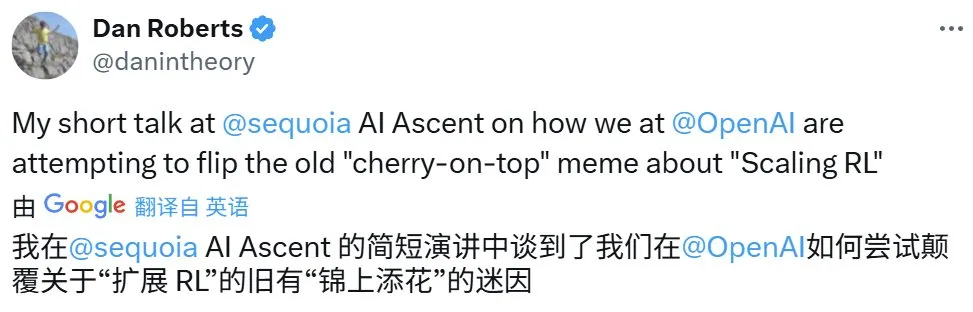 近日,在红杉资本主办的 AI Ascent 上,OpenAI 研究科学家 Dan Roberts 做了主题为「接下来的未来 / 扩展强化学习」的演讲,其上传到 YouTube 的版本更是采用了一个更吸引人的标题:「9 年实现 AGI?OpenAI 的 Dan Roberts 推测将如何模拟爱因斯坦。」