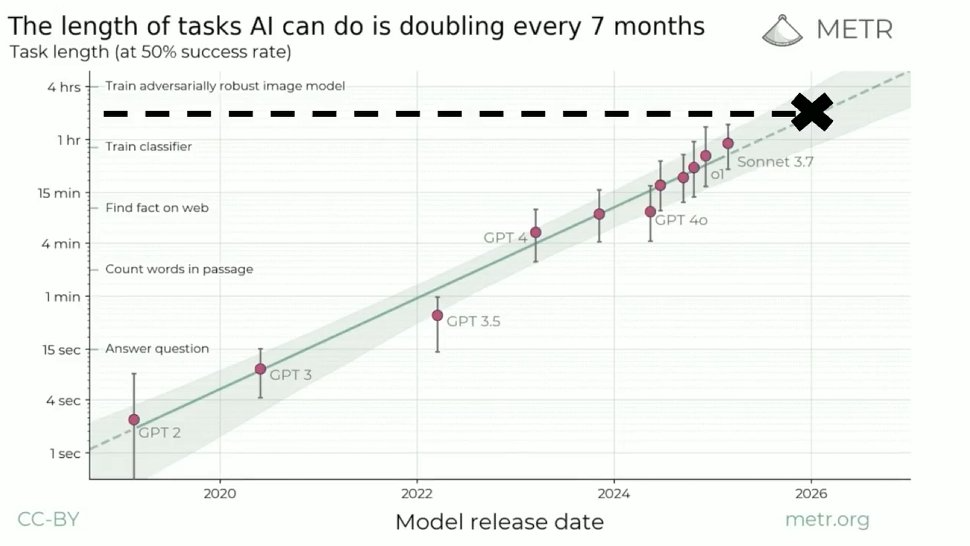 总结一下,这就是接下来会发生的事情。这是去年 AI Ascent 上的一张图,其中 Y 轴是半对数的。可以看到,智能体 / AI 所能处理的任务的长度每 7 个月就会翻一倍。根据这张图,他们可以执行长达一个小时的测试了,但明年呢?大概会在 2 到 3 小时之间。