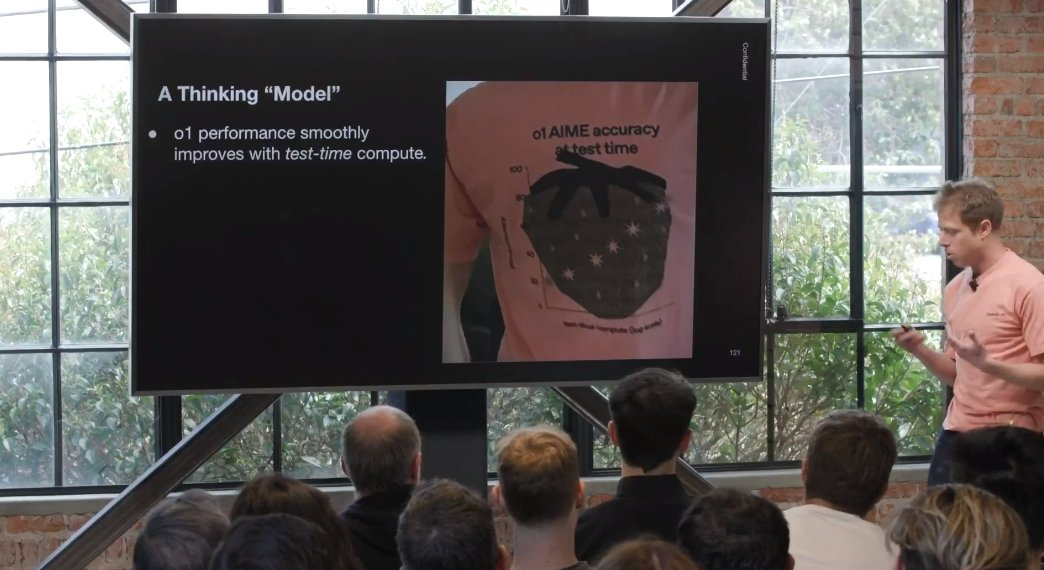 这个发现太重要了,我们甚至把它印在了 T 恤上。因为这代表了一个全新的扩展维度 —— 不仅仅是训练时间扩展,还包括测试时间扩展。