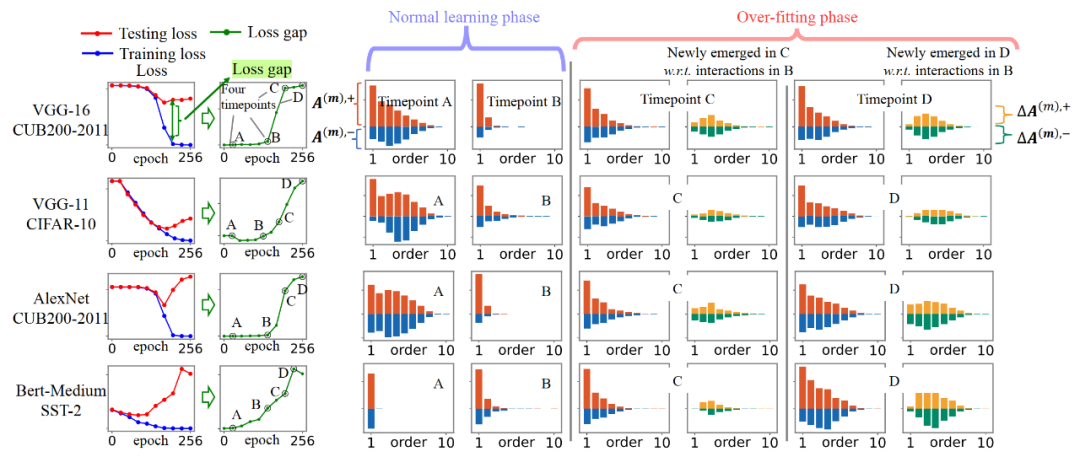 具体地,我们在多个模型在多个数据集上使用分解算法来提取两种交互的分布。对于每个模型,我们选取了该模型在训练过程中的四个时间点,进而展示神经网络训练过程中可泛化交互的分布和不可泛化交互的分布变化。结果如图 7 所示