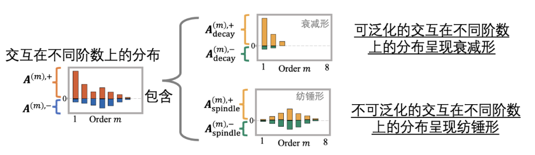图 2. 我们发现神经网络的交互可以被分解为两部分:服从衰减形分布的可泛化的交互和服从纺锤形的不可泛化的交互