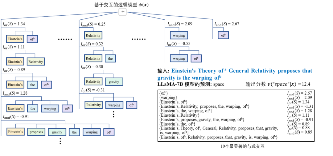 ,当集合内输入单元均出现时,为 LLM 预测下一个词素「space」(目标单词 spacetime 中的词素 token)贡献一个正的数值效应。「或交互」表示神经网络所等效建模的输入单元间的「或逻辑」关系,当集合 S 内任一输入单元出现(不被遮盖)时,该「或交互」为神经网络的分类自信分数贡献一个数值效应