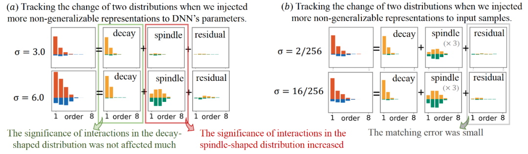 。当我们向神经网络注入更多不可泛化的表征时,分解算法提取出了更显著的不可泛化交互分布和几乎稳定的可泛化交互分布。