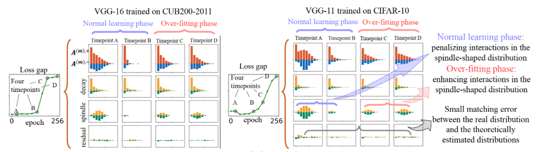 实验一:当我们训练神经网络直至过拟合,我们发现神经网络过拟合前的交互往往呈现衰减形分布,而过拟合阶段新出现的交互往往呈现纺锤形分布。
