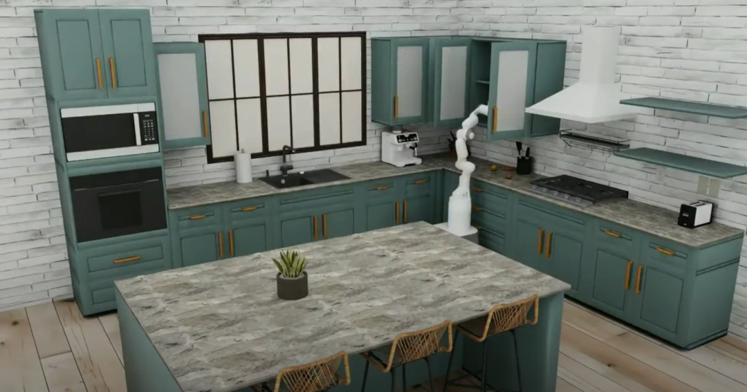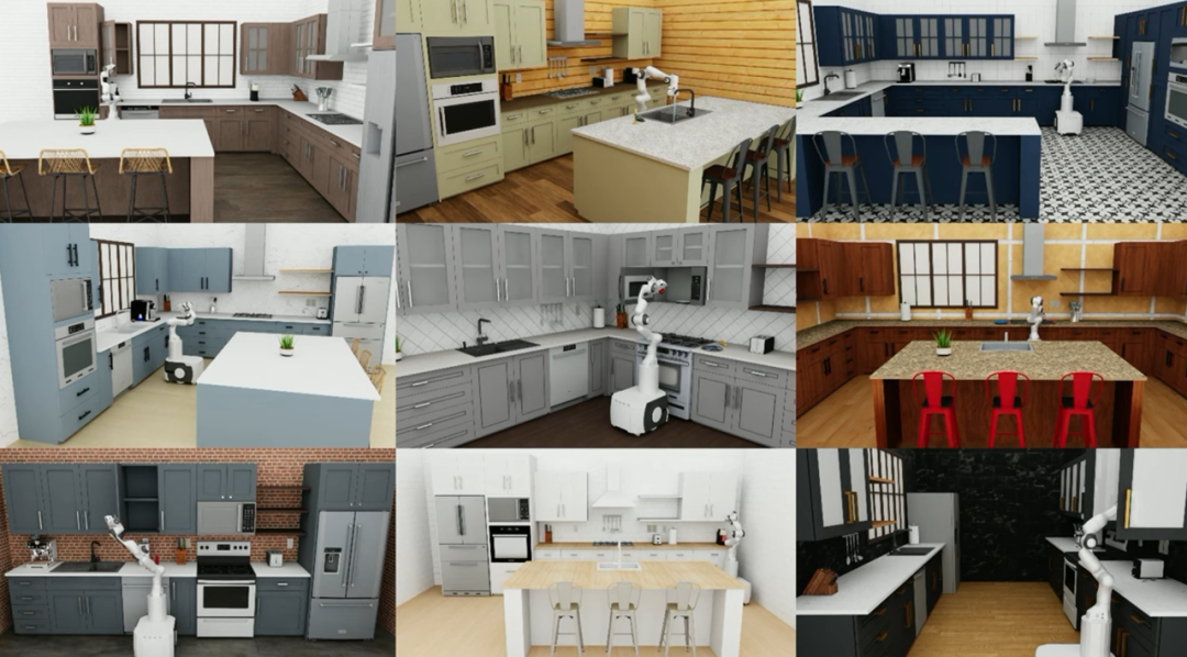 将所有这些放在一起,我们构建了一个名为 RoboCasa 的框架,它是日常任务的一个组合模拟。这里的一切,除了机器人,都是生成的。你可以组合不同的场景,但它仍然依赖于这个经典引擎来运行,但你已经可以从中获得很多任务。