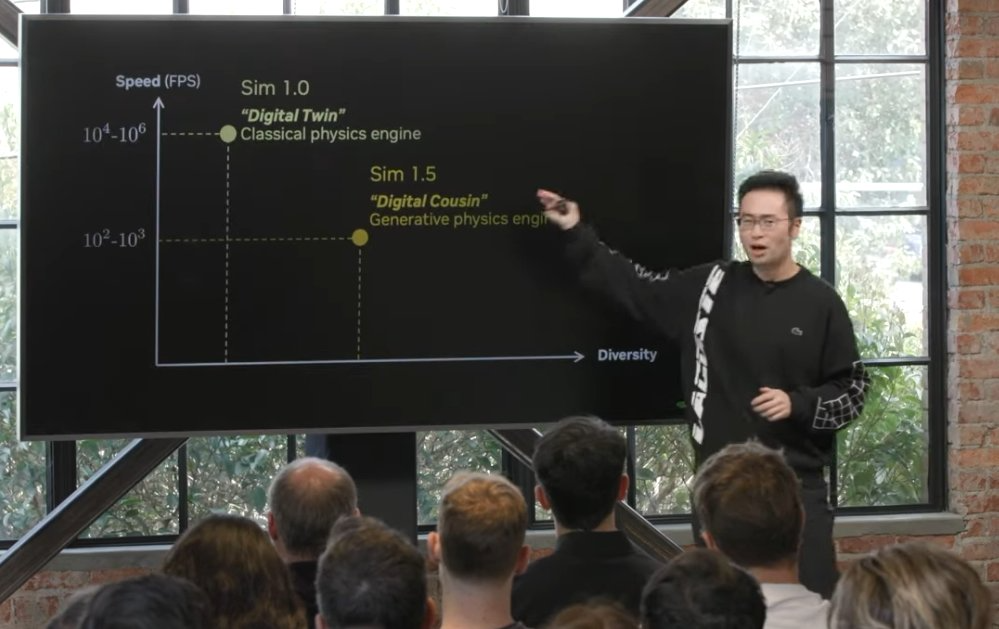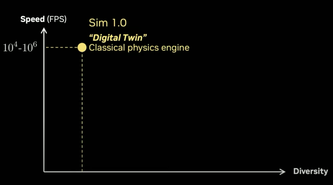 所以,如果我们将其放在这个图表上,纵轴是速度,横轴是模拟的多样性,我们称之为模拟 1.0,数字孪生范式,它是一个经典的向量化物理引擎,你可以运行到每秒 10000 帧甚至一百万帧。但问题是你必须建立一个数字孪生。你需要有人建造机器人,建造环境和一切。这非常繁琐,且需要手动完成。