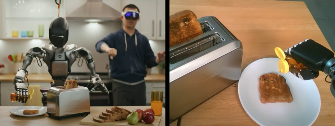 我们有一种非常复杂但也非常昂贵的方法,叫做遥操作(teleoperation)。你可以让人佩戴某种 VR 头显,它能识别你的手势并将其传输给机器人。这样你就可以教机器人技能,比如从烤面包机中取出面包,然后倒上蜂蜜。但可以想象,这是一个非常缓慢且痛苦的过程。