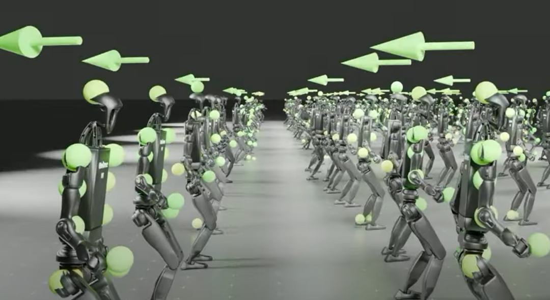 接下来,我们还可以将其应用于更复杂的机器人,如人形机器人。在短短两小时的模拟时间内,这些人形机器人就经历了 10 年的训练,学习行走,然后你可以把它们迁移到现实世界。无论实体是什么,只要你有机器人模型,你就可以模拟它,并且可以实现行走。
