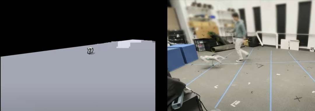 但我们可以训练它,在 10000 个并行运行的模拟上,我们可以将其零样本迁移到真实机器人上,无需任何微调。