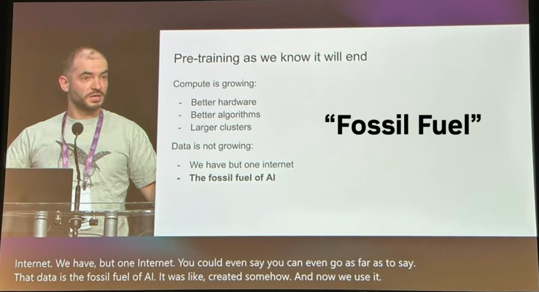 你们知道大语言模型研究人员经常抱怨,对吧?最近有个叫 Ilya 的人抱怨说:大语言模型预训练的数据快用完了。他甚至称互联网为「AI 的化石燃料」。他说我们快没有数据来训练大语言模型了。但是,如果你了解机器人模型,你就会知道大语言模型研究人员被宠坏了。我们甚至连化石燃料都没有。
