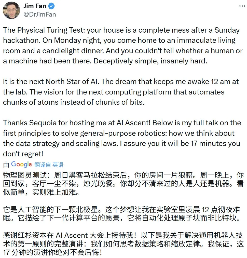 原文标题:机器人的「物理图灵测试」,英伟达Jim Fan 17分钟演讲揭秘具身Scaling Law
