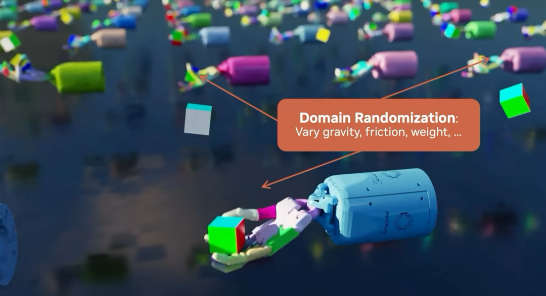 第二点,10000 个环境副本不能都相同。你必须改变一些参数,如重力、摩擦力和重量。我们称之为域随机化。