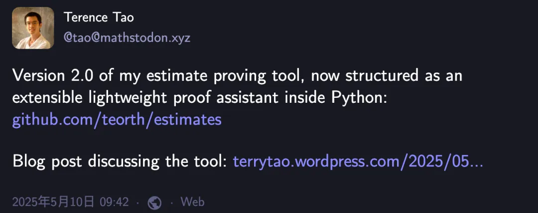 陶哲轩估计验证工具快速迭代至2.0版本,Copilot助力,并展示AI辅助数学形式化证明的实验,释放AI在数学研究中的潜力。