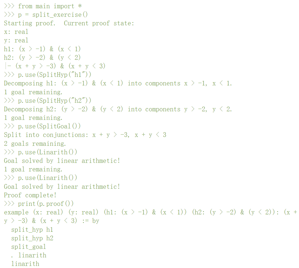 证明助手的工作方式是:用户指示助手使用各种「策略」来简化问题,直到问题得到解决。在本例中,该问题可以通过线性算法求解,具体形式化为「Linarith ()」策略: