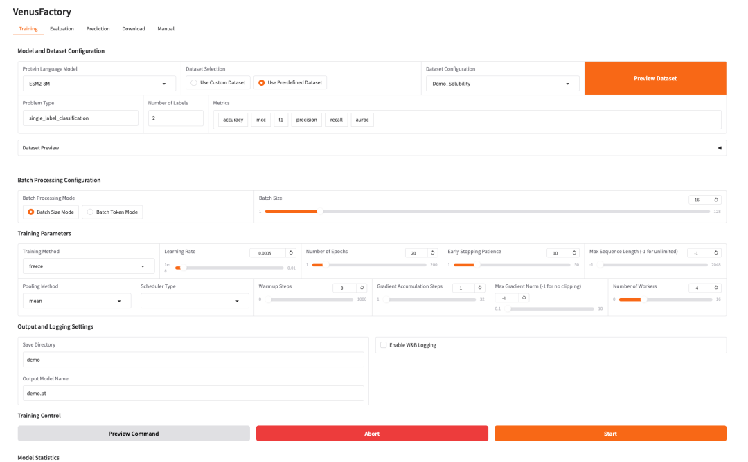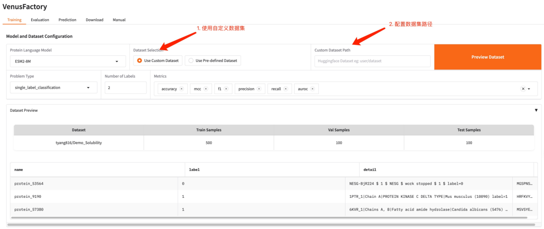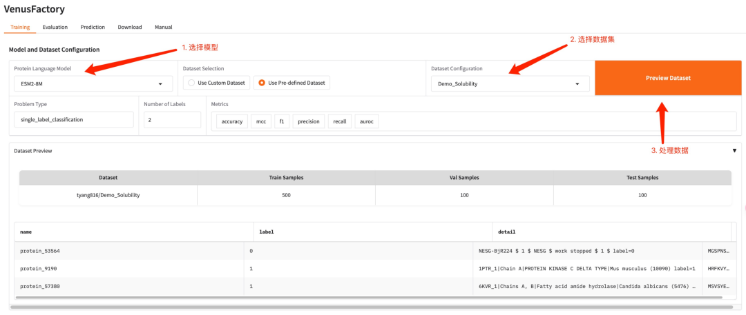 借助这些基准数据集和评测结果,用户可以轻松比较不同模型的性能,选择和优化方案。同时,VenusFactory 也提供了全部数据集的下载功能,用户可以一键获取相应的蛋白质序列、结构、标签等信息。