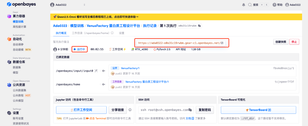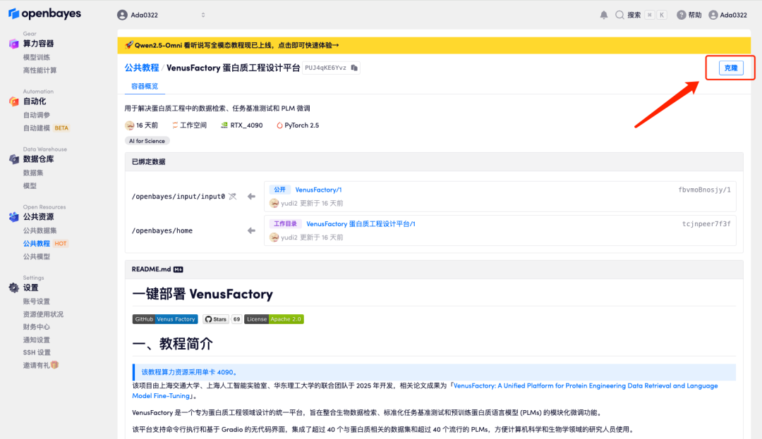 为了方便读者体验 VenusFactory,HyperAI超神经官网的教程版块上线了「VenusFactory 蛋白质工程设计平台」的一键部署教程,以下为详细使用介绍⬇️