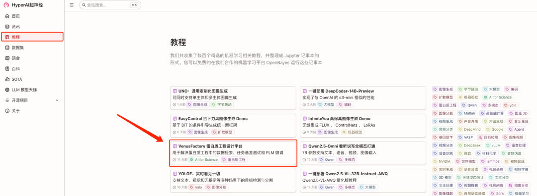 1. 在浏览器输入网址 hyper.ai,进入首页后,点击「教程」页面,并选择「VenusFactory 蛋白质工程设计平台」,点击「在线运行此教程」。