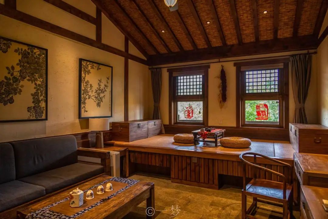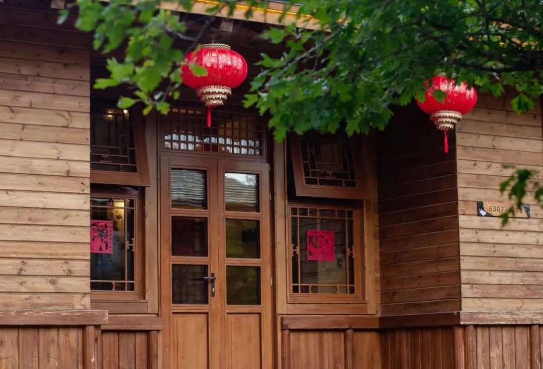 采用原木结构、乌拉草房顶,搭配花格窗棱、大红灯笼以及充满年代感的摆件,真实还原了东北民居韵味。