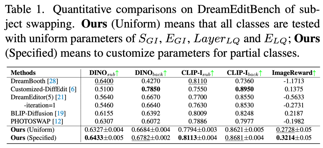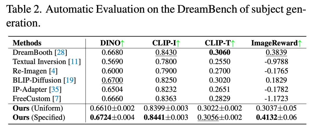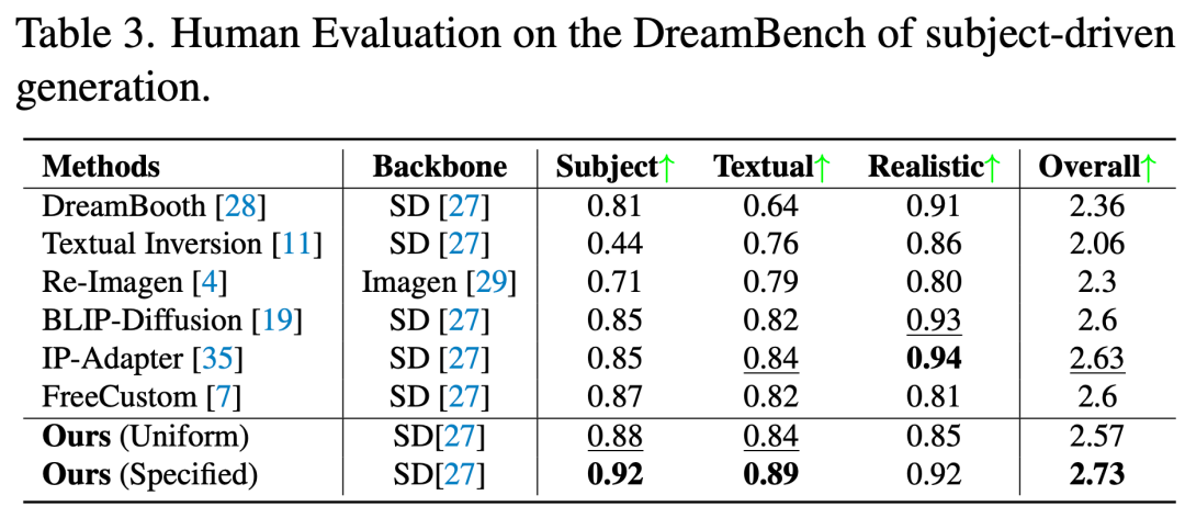 表 1 展示了基于 DreamEditBench 的主题替换任务量化评估结果。相较于 BLIP-Diffusion、DreamBooth 和 PHOTOSWAP 等方法,MCA-Ctrl 在各项指标上均展现出相当或更优的性能表现。表 2 呈现了 DreamBench 上主题生成任务的评估结果。统一参数测试时,MCA-Ctrl 表现优于 Text Inversion、Re-Imagen 和 IP-Adapter,但略逊于 DreamBooth 和 BLIP-Diffusion。经过参数优化后,MCA-Ctrl 取得了与 BLIP-Diffusion 和 DreamBooth 相当的结果。此外,表 3 的人工评估结果表明,MCA-Ctrl 在主体对齐度和文本对齐度方面均表现突出。