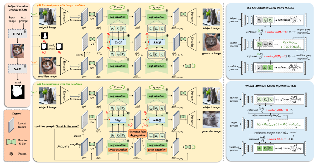 本方法分为通过条件图像和条件文本进行图像定制化,如下图(A)和(B)所示。具体而言,本方法首先引入主体定位模块(Subject Location Module,SLM)对图像进行精准定位,然后通过三个并行扩散过程中的自注意力注入与查询机制,在保持条件信息语义空间布局的同时捕获特定主体的视觉特征表示。