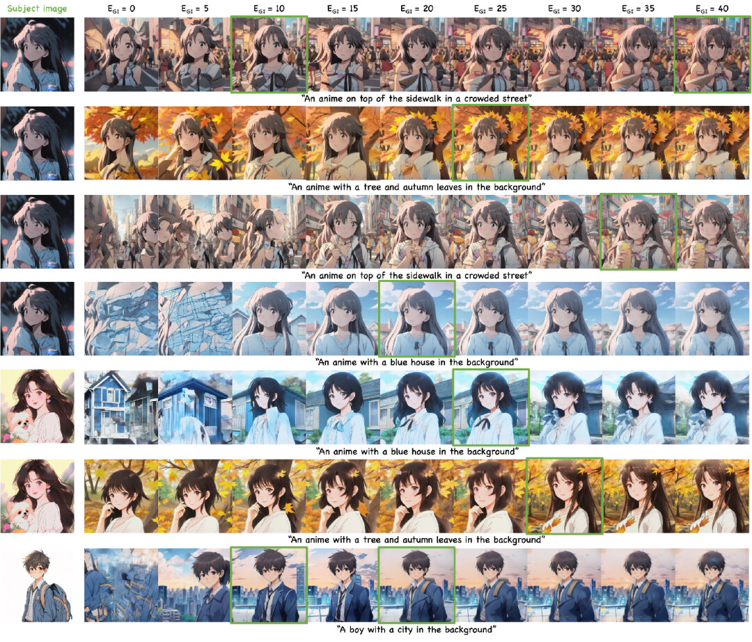 我们在下图中展示了对图像生成的影响。实验表明,在复杂场景下,若完全省略 SAGI 操作,会导致目标定位失败和全局特征混淆等问题。随着的逐步增加,主体特征会呈现越来越清晰的表现。但值得注意的是,当超过总去噪步骤的 60%(此为大多数案例的经验阈值)后,继续增加 SAGI 执行步数对图像质量的提升效果将趋于饱和。具体而言,这一现象揭示了两个重要发现:(1)在去噪过程的前期阶段,SAGI 能有效建立主体与背景的语义关联;(2)在去噪后期,过度的全局特征注入反而可能破坏已形成的细节特征。这种 “边际效应递减” 特性为算法参数优化提供了重要指导。