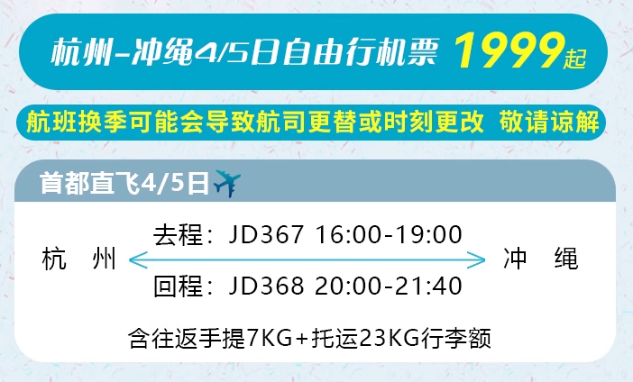 8、杭州=冲绳4/5天往返机票,含税1999元起