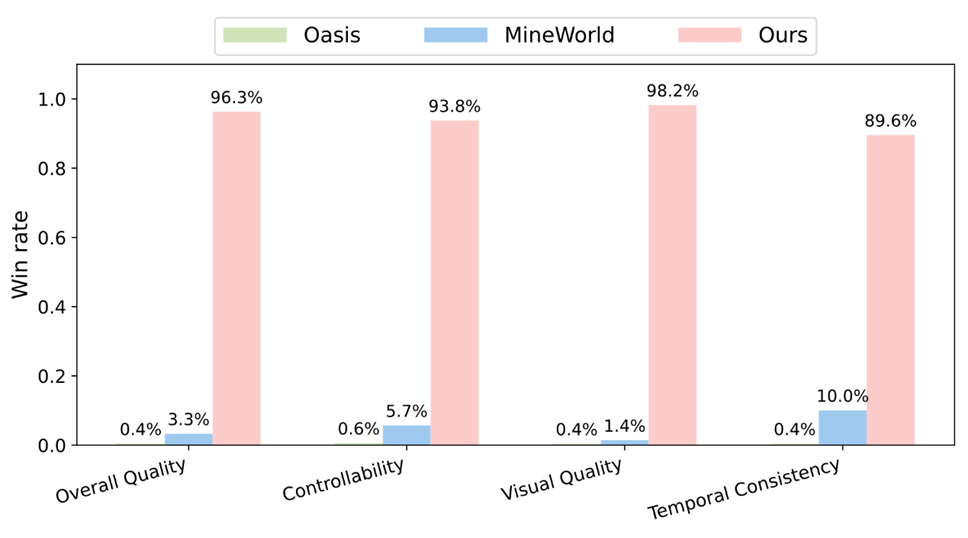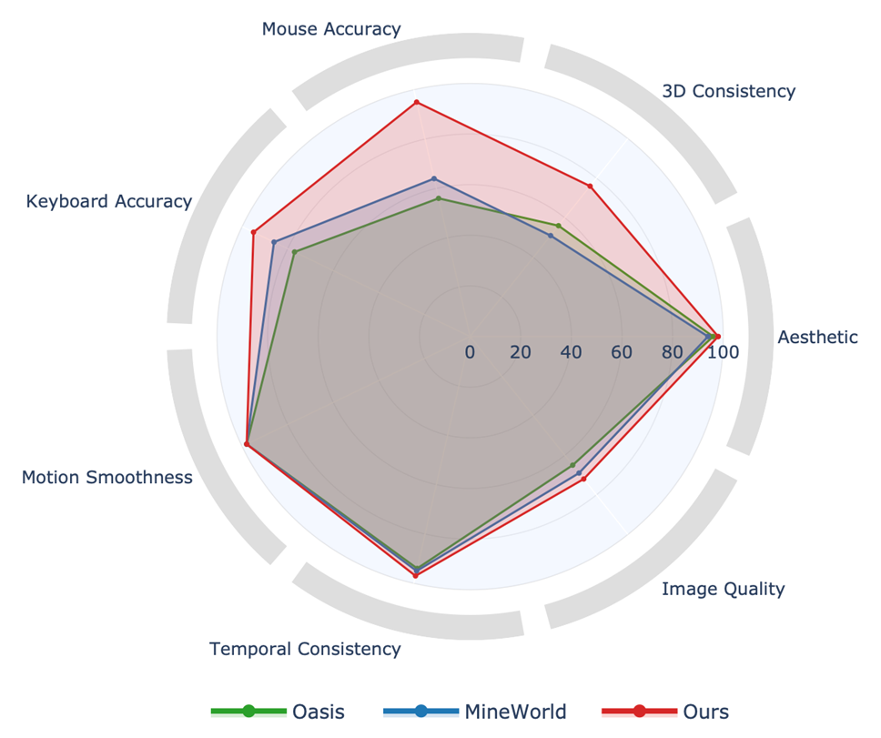 在这个基准上,Matrix Game 与知名创业公司 Decart 的开源方案 Oasis 和微软的开源模型 MineWorld 进行了 PK,在四大维度上均取得领先成绩。