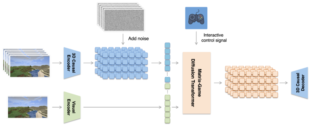 MatrixGame 能够直接通过视觉内容感知、解读和建模世界,可以实现一致且结构化的理解。结合用户的动作输入,世界模型可以像 AI 图像生成工具一样直接生成「3D 游戏画面」。为了避免此前很多世界模型生成长时序内容不停变化的出戏情况,Matrix-Game 每次生成会以之前的 5 帧运动作为上下文逐段递进生成,保证了输出内容在时间上的连贯性。