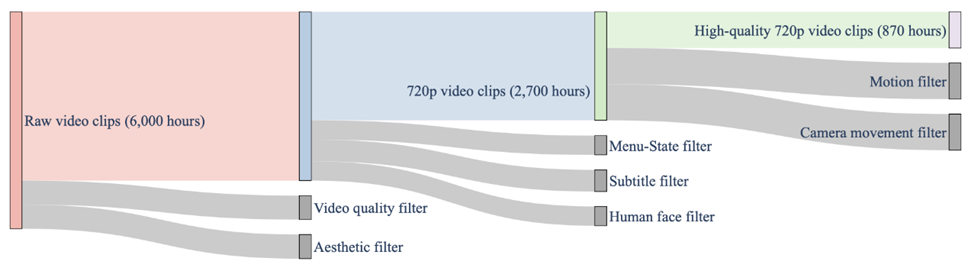 Matrix-Game-MC 数据集涵盖从无标签预训练数据到精细标注的可控视频全流程。其中,无标签预训练数据来自 MineDojo 数据集中的视频资源,研究团队利用 MineDojo 工具系统性地采集了约 6000 小时的原始 Minecraft 游戏视频,并设计了三阶段过滤机制,依次对画质美学、动态合理性与视角稳定性等方面进行筛选,最终获得了超过 2700 小时的中质量数据和 870 小时的高质量数据,用于支持基模型的无监督预训练。