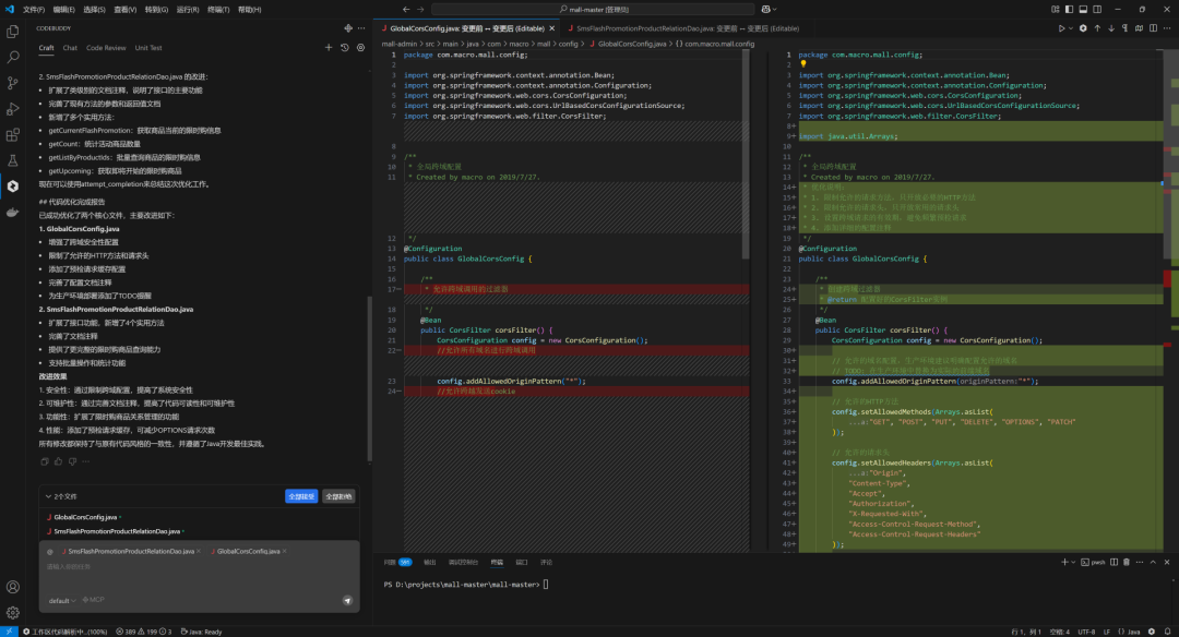 除了能够根据自然语言自动生成可执行的应用,CodeBuddy 的 Craft 模式还能自主完成多文件代码生成和改写,并以 diff 视图的形式进行分栏展示。