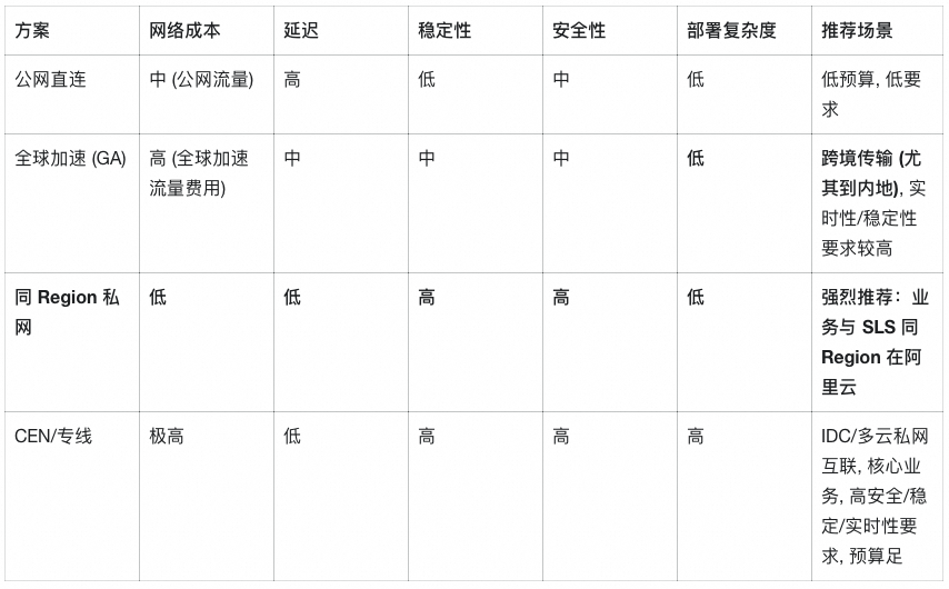 架构:海外服务器 (Agent) -> 公网 -> 就近阿里云 PoP (GA 加速接入点) -> 阿里云骨干网 -> SLS Endpoint (目标 Region, 特别是内地)
