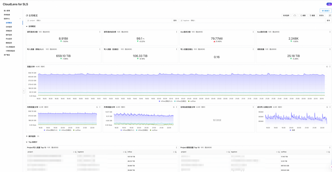 为了有效监控和诊断此类问题,阿里云日志服务 SLS 提供了 CloudLens for SLS 功能。这项服务为您提供了一个集中化的视图,能够清晰展示您账号下所有 Project 的核心资源消耗指标,包括: