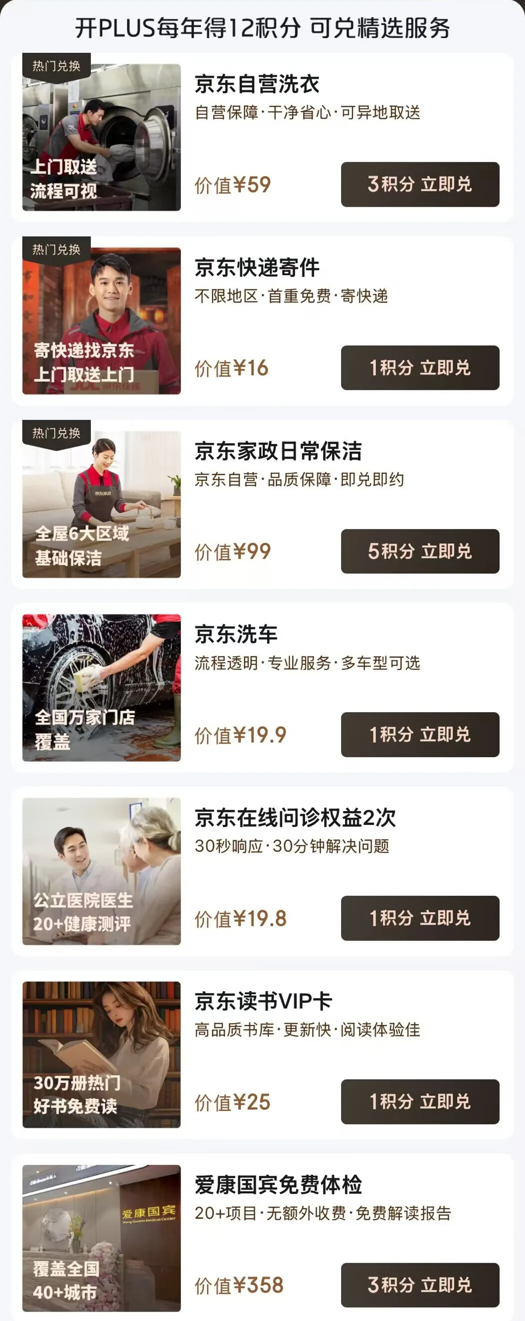 上文帅帅提到,今年京东Plus会员上线了“生活权益包”。权益方面多了生活服务包,包含:免费家政,免费洗衣,免费洗车,免费快递等。每年送12个权益积分,可自由兑换想用的权益: