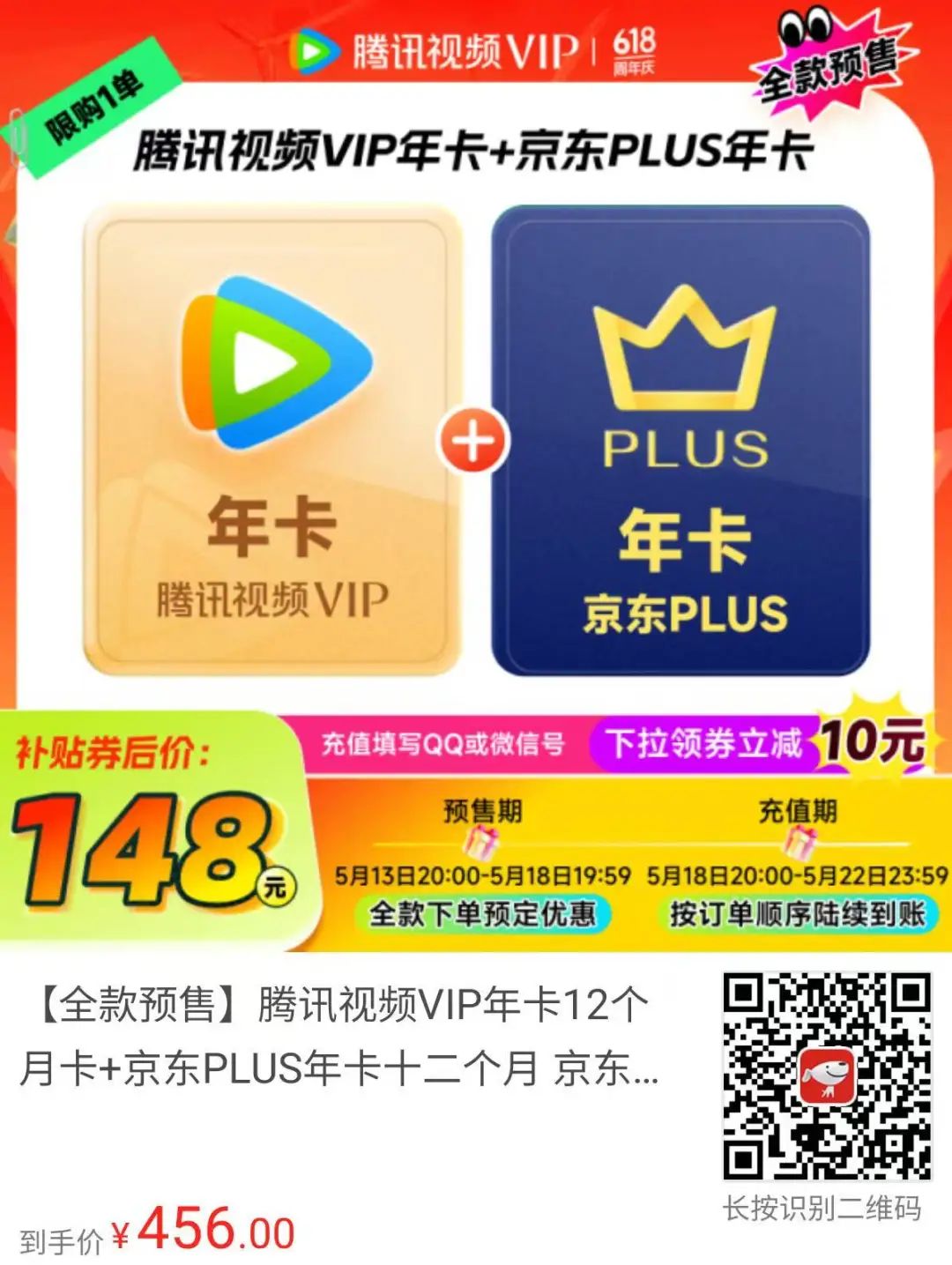 腾讯视频年卡会员+京东Plus会员=148元